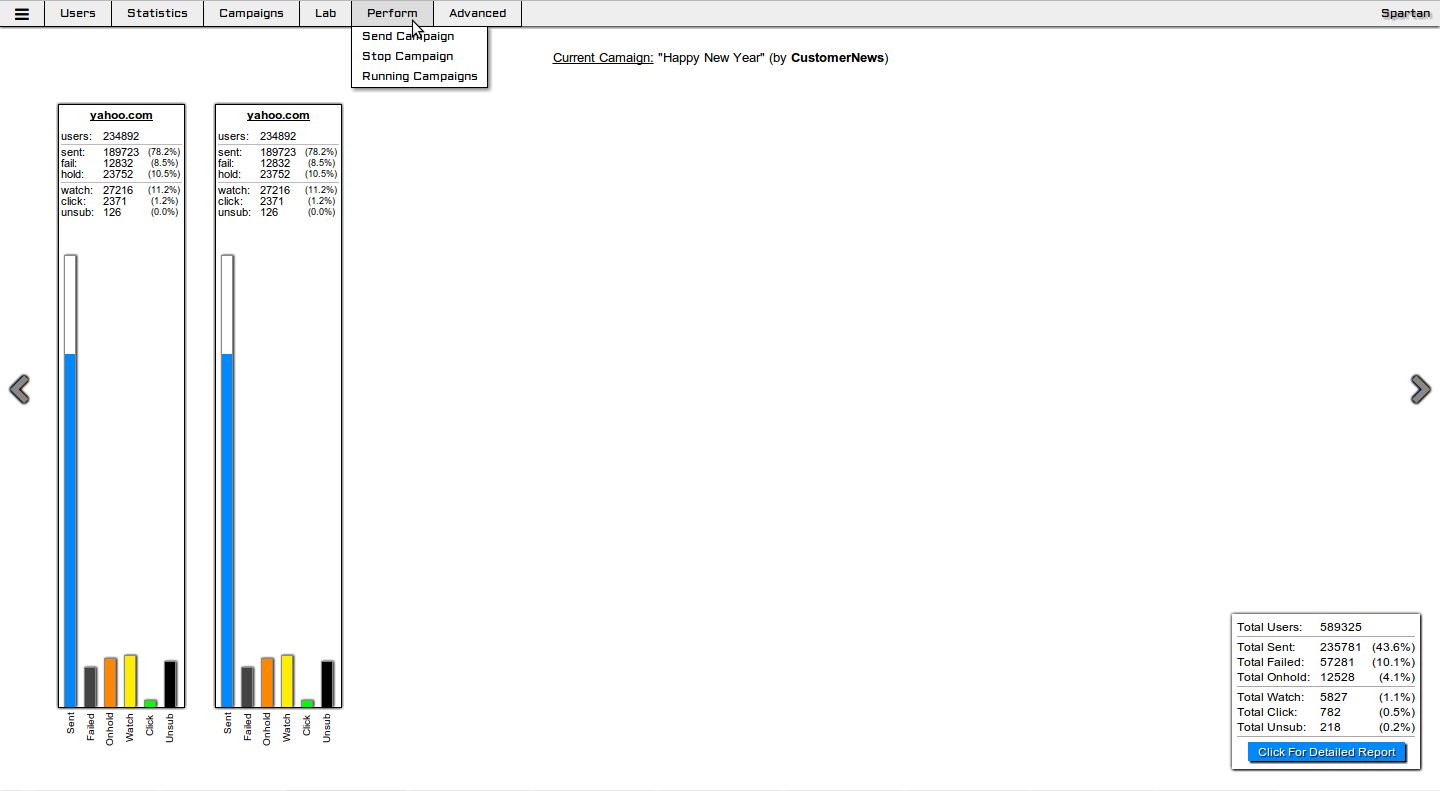 At the core of our mailing infrastructure, is the Spartan™ mailing system, which is our source of pride and dignity and is the result of 5 years of active research and developement in the field of email marketing. This is a web-based mailing administration system, where you can upload your creatives, users lists, and templates and manage your campaigns and get full statistics on how well your e-mail campaigns perform.